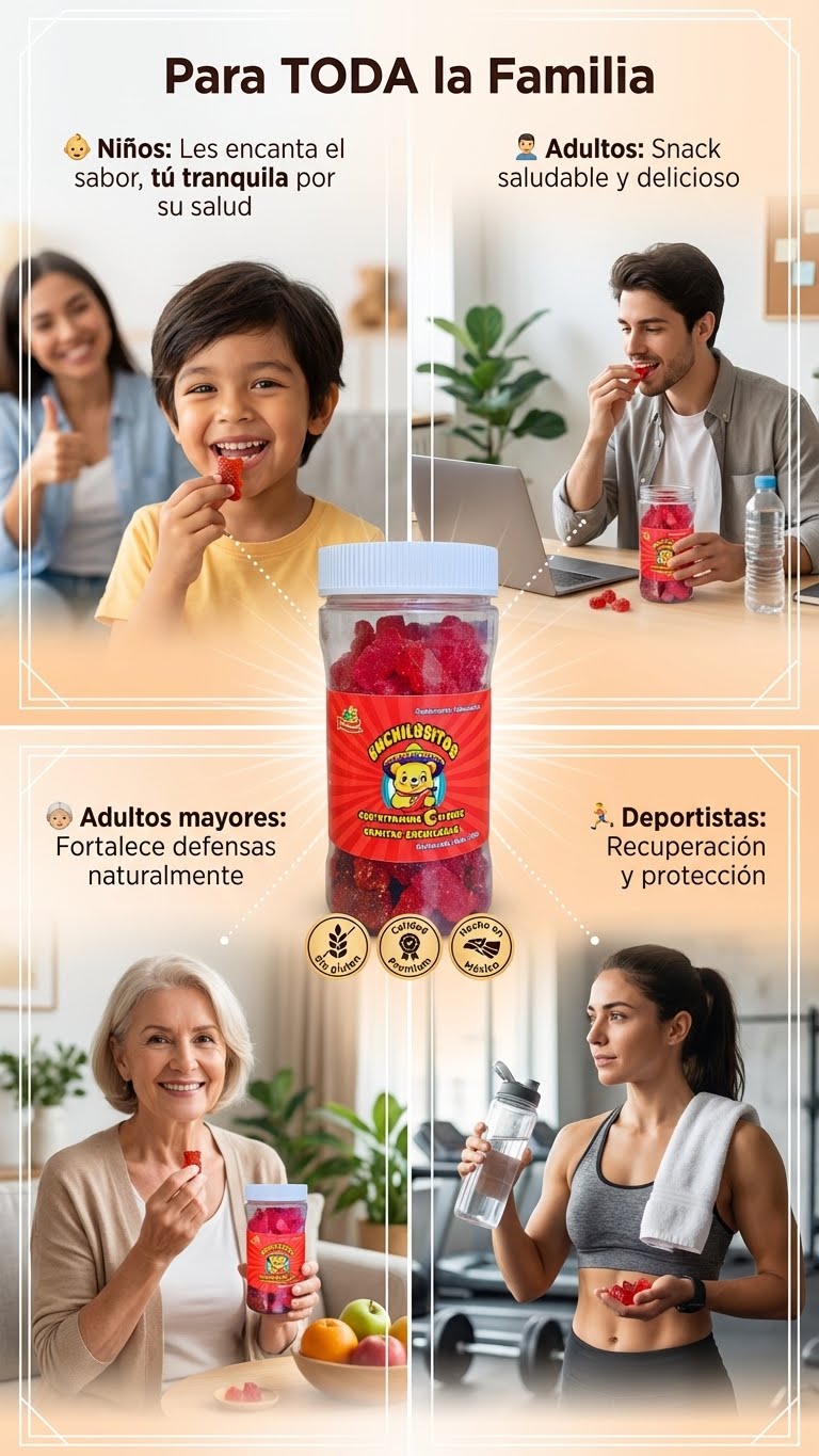 ¡Sí! Enchilositos están especialmente formuladas para ser aptas para niños y adultos. Aunque tienen un sabor picante, no es excesivo, y su forma divertida de osito hace que los más pequeños disfruten de cada bocado mientras reciben sus vitaminas.